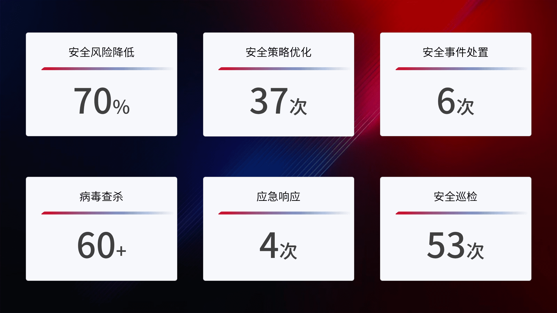 提供全面的安全事件报告体系,,包括处置报告、、周报、、、季度和年度总结,,结合持续监控,,帮助客户深入了解网络安全状况。。
